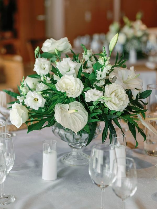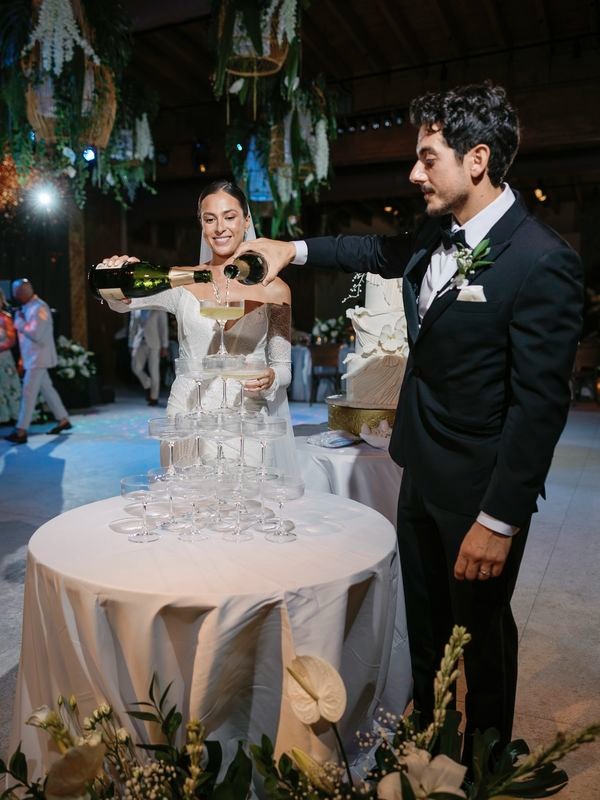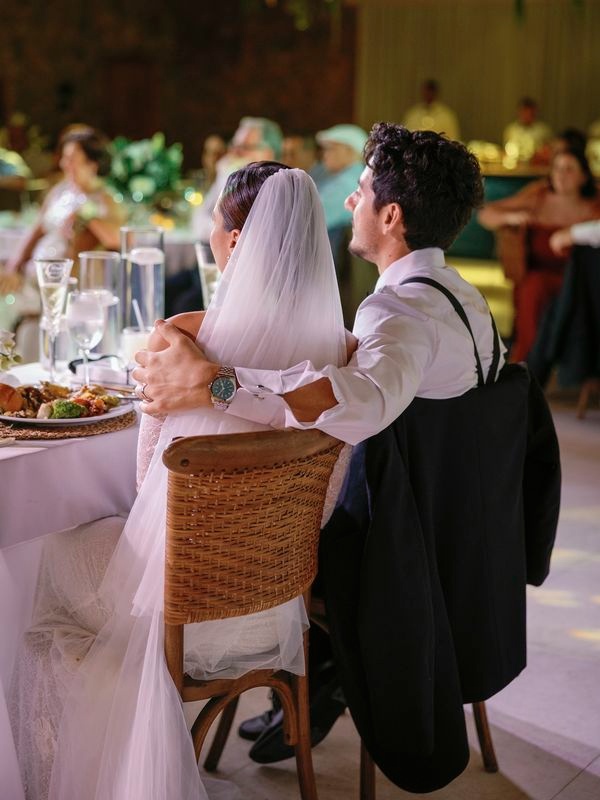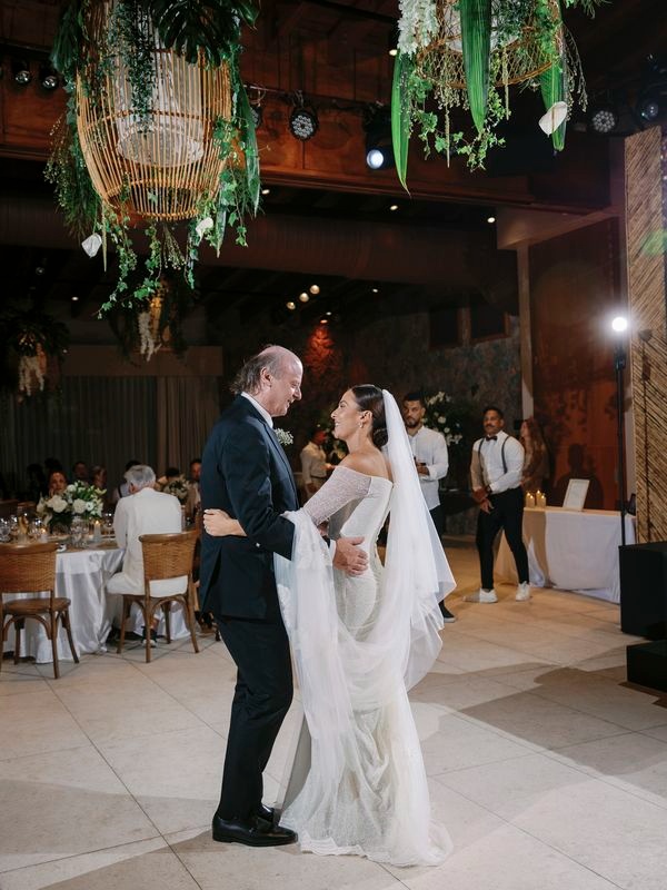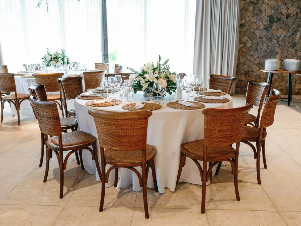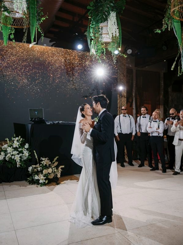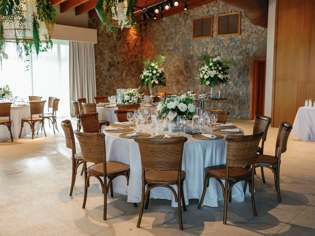 Después de los votos, todos se dirigieron al encantador restaurante de Chez Bisutti Punta Cana para la recepción. La transición de la playa al salón fue fluida, y la decoración capturó la atención desde el primer momento. Las mesas lucían arreglos verdes llenos de vida combinados con flores blancas, creando una paleta tropical moderna, fresca y refinada. Además, la iluminación cuidadosamente elegida y los detalles personalizados hicieron el ambiente cálido e íntimo.