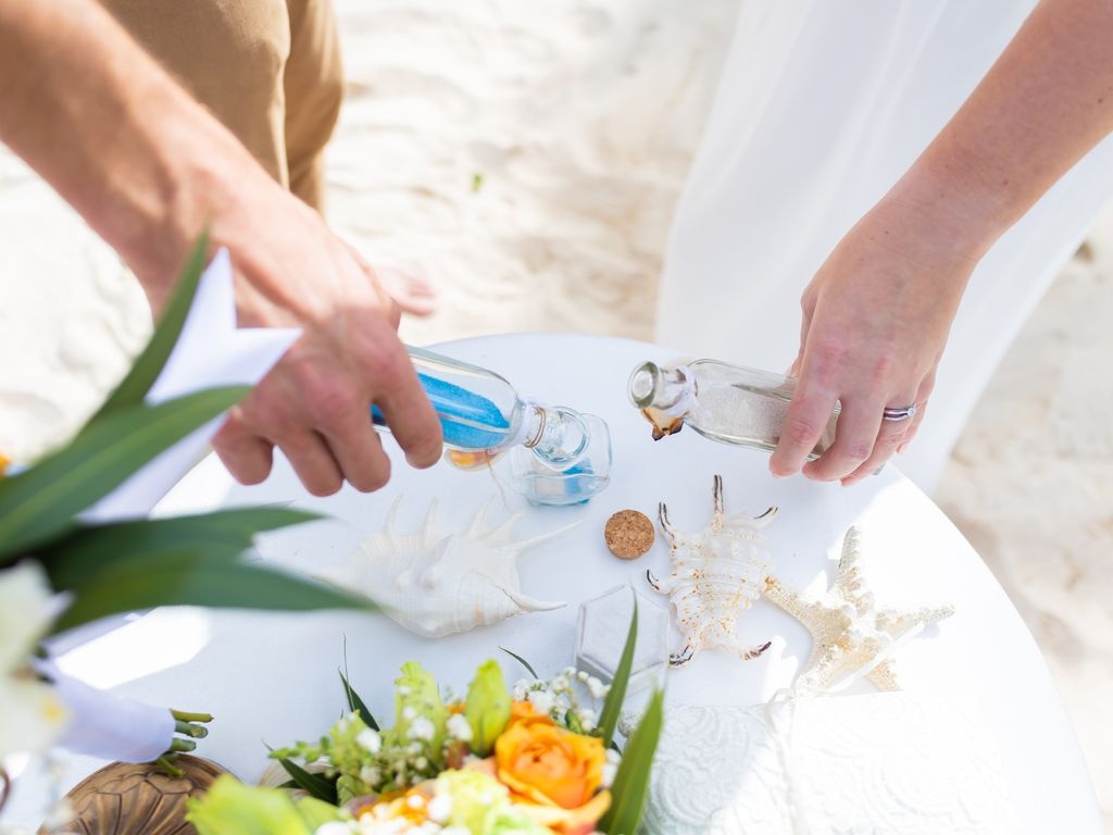 Bajo un arco redondo decorado con flores blancas y hojas de palma, el novio esperaba con emoción a su amada. Luego, su primer encuentro fue muy emotivo. Los votos, llenos de sentimiento, y la simbólica ceremonia de la arena en una botella de cristal hicieron que el día fuera inolvidable. Después, la celebración continuó con champán, pétalos de rosa y sonrisas infinitas.