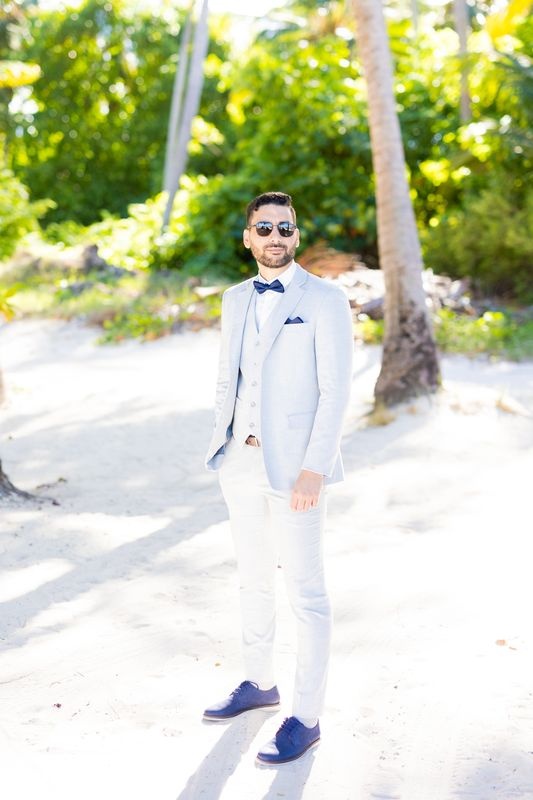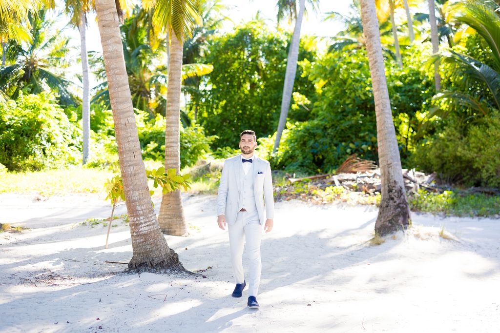 El novio llegó vestido con un elegante traje clásico. Mientras tanto, la novia lucía radiante con un largo vestido blanco que se movía suavemente con la brisa del océano. Juntos crearon una imagen romántica y muy elegante en este escenario tropical.