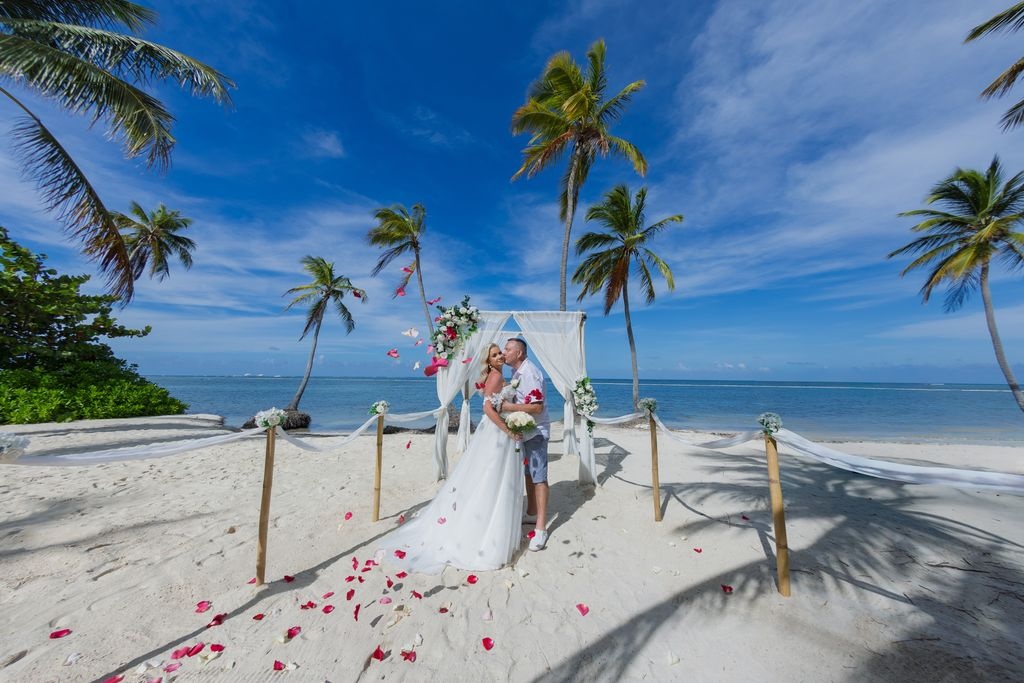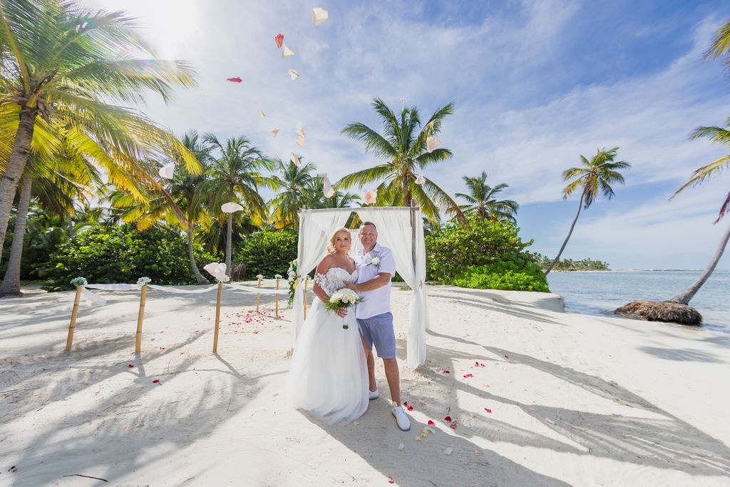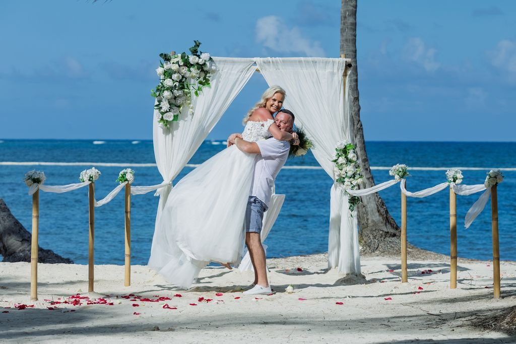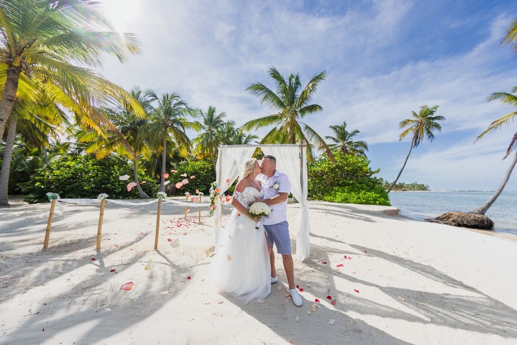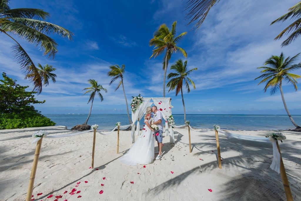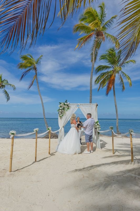 Beach wedding Punta Cana: la pareja celebró en la orilla junto a su hija de un año y medio, con un arco de bambú, telas blancas y flores blancas. El mar turquesa, la arena clara y las palmeras crearon un ambiente tranquilo y alegre.
