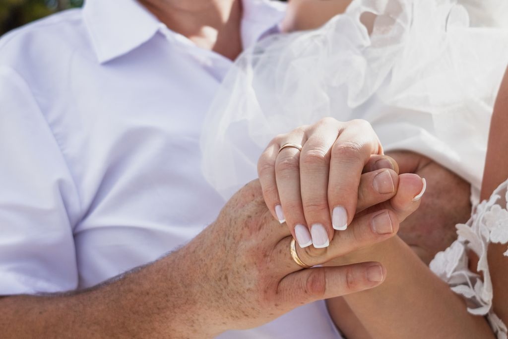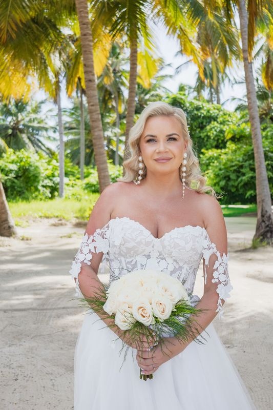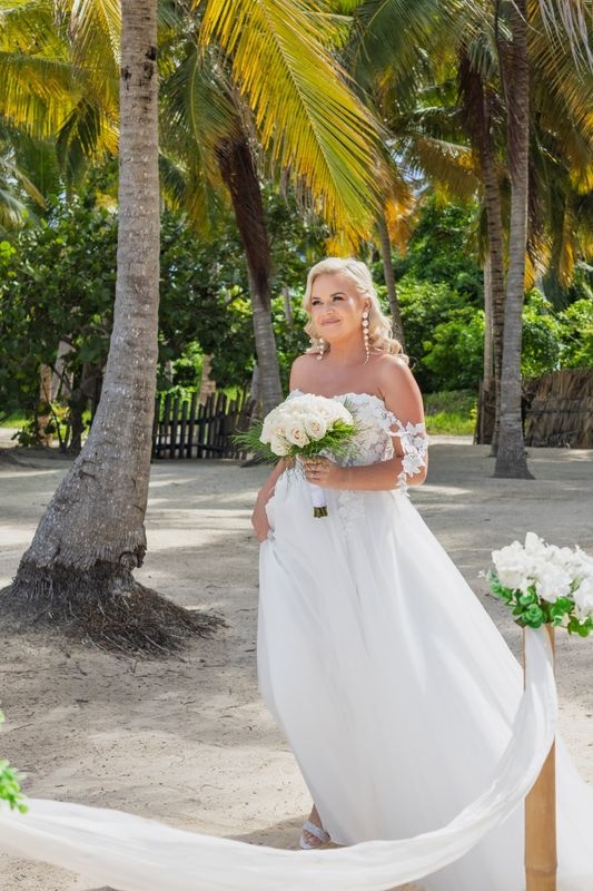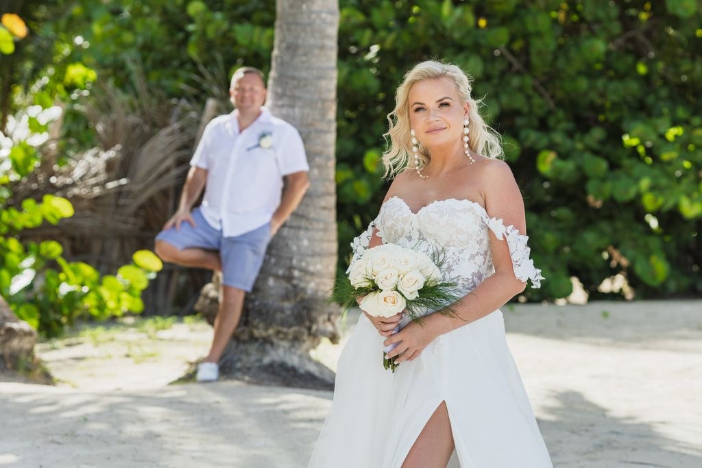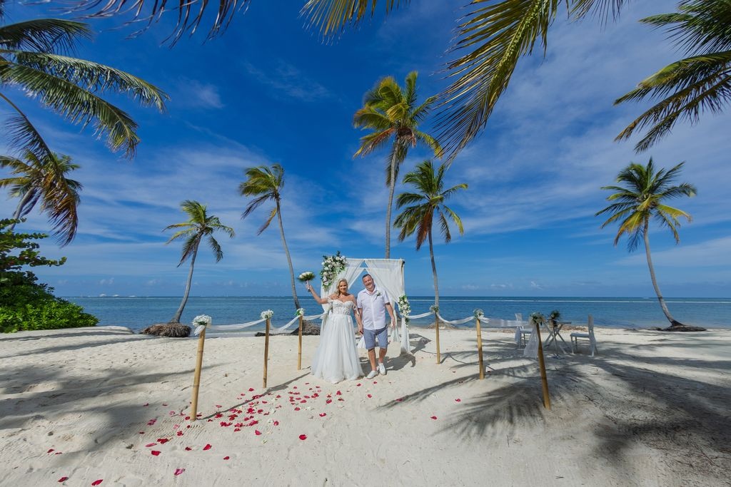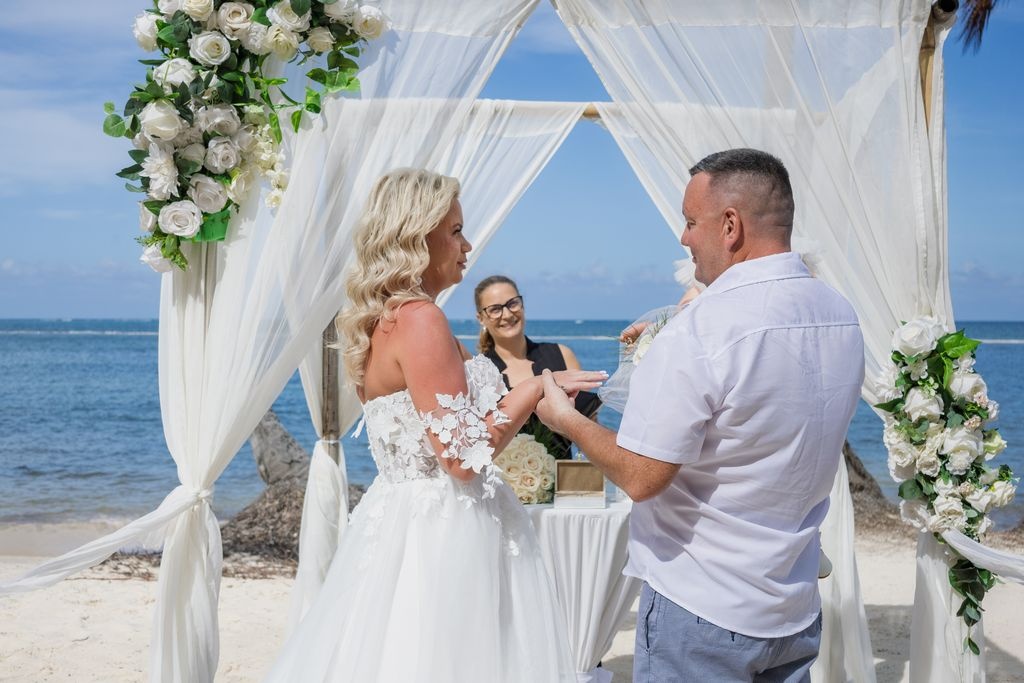 Beach wedding Punta Cana: la pareja celebró en la orilla junto a su hija de un año y medio, con un arco de bambú, telas blancas y flores blancas. El mar turquesa, la arena clara y las palmeras crearon un ambiente tranquilo y alegre.