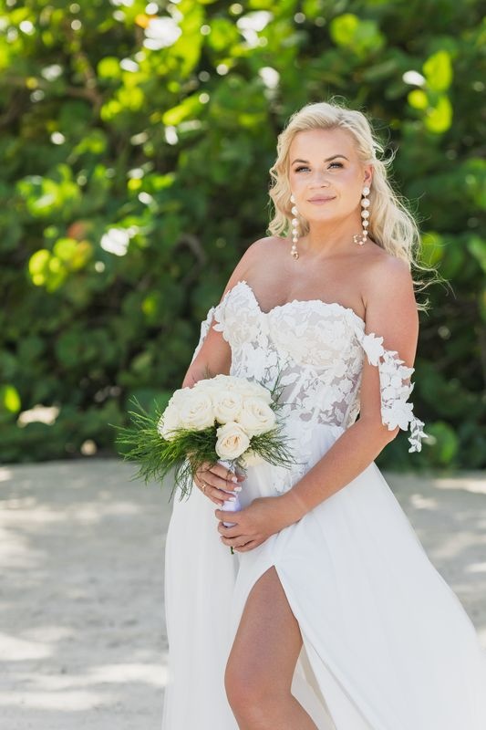 La ceremonia tuvo lugar directamente sobre la arena blanca, justo donde las olas tocan suavemente la orilla. Un arco de bambú se levantó frente al agua. Además, lo decoramos con telas blancas y flores delicadas. El diseño se veía ligero y elegante. La brisa del océano movía las telas y añadía un toque especial a cada fotografía.