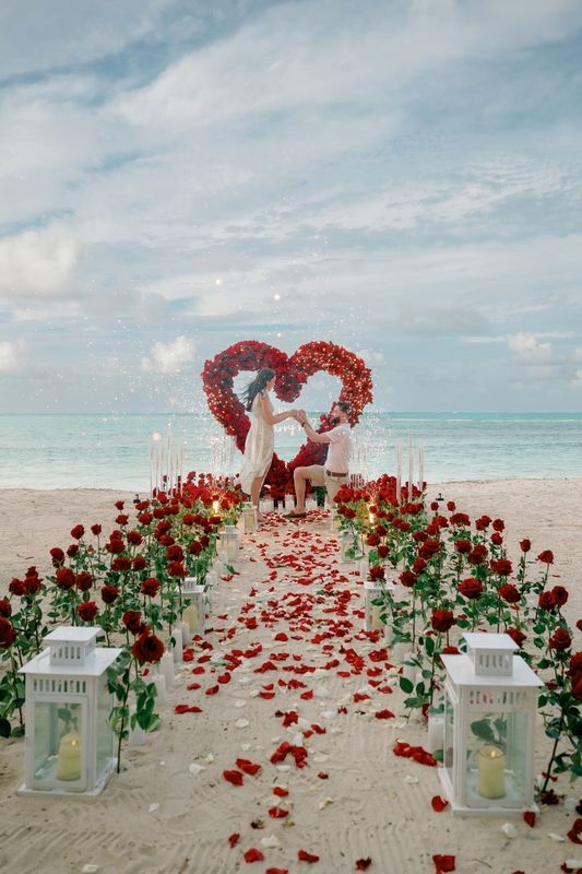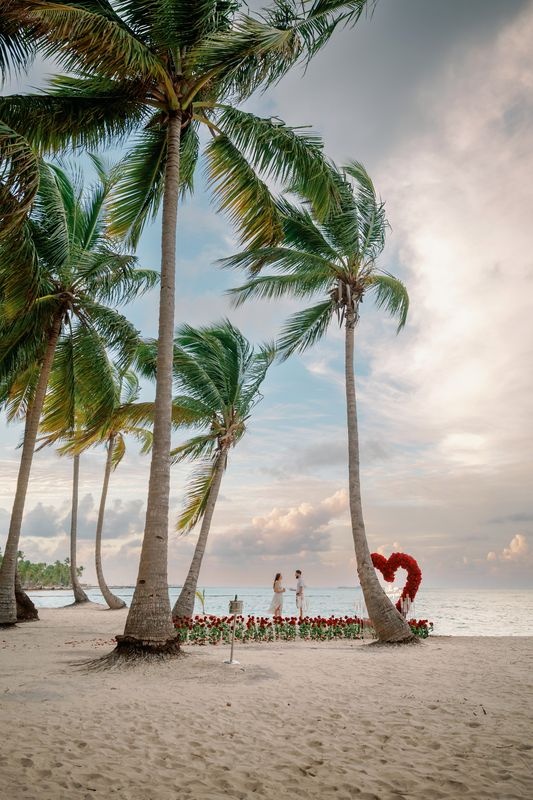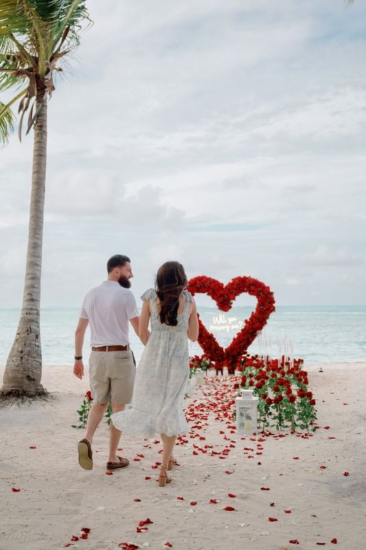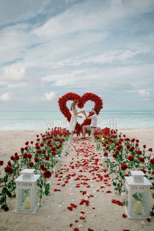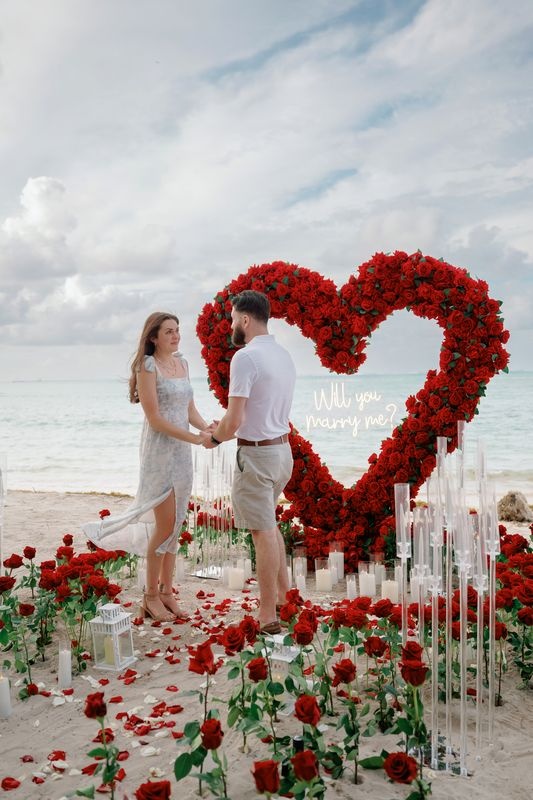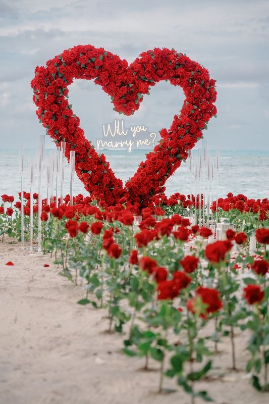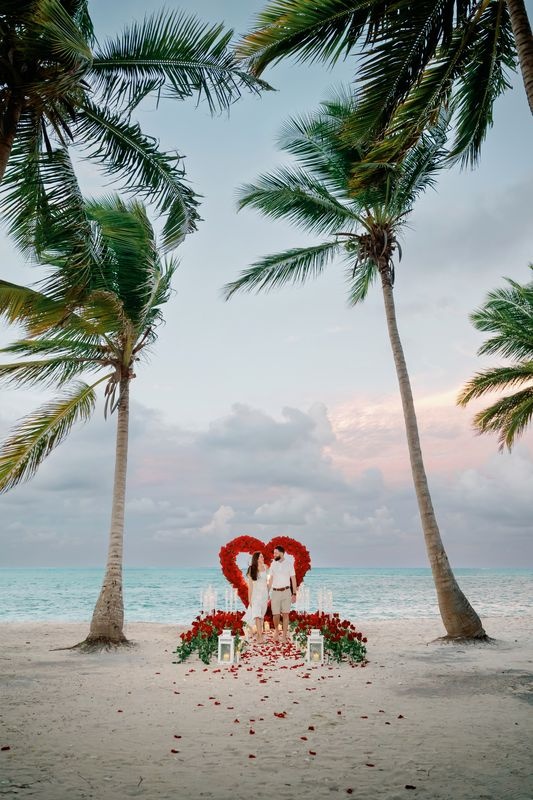 Propuesta de matrimonio en la playa Punta Cana con corazón de rosas