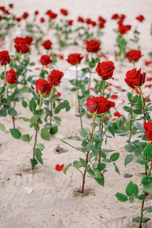 Desde el inicio, la escena impresionó. Un camino de pétalos de rosas rojas se extendía sobre la arena suave y guiaba hacia un rincón privado bajo las palmeras. Además, la brisa marina y el sonido de las olas aportaban calma y armonía.