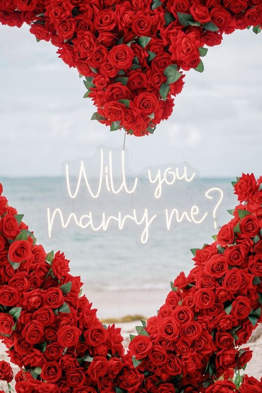 Al final del camino, un escenario espectacular esperaba a la pareja. Un gran corazón formado por rosas rojas ocupaba el centro. Alrededor, más rosas y velas encendidas creaban una atmósfera cálida y romántica. Dentro del corazón, un letrero luminoso con la frase “Will You Marry Me?” añadía un toque moderno y llamativo. Como resultado, todo el espacio se sentía mágico y muy especial.