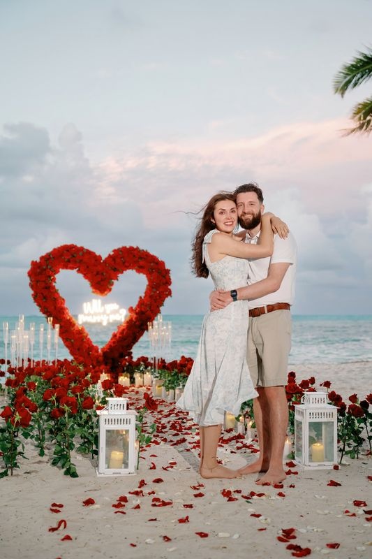 Esta propuesta de matrimonio en la playa Punta Cana demuestra cómo los detalles marcan la diferencia. El corazón de rosas, las velas y las emociones sinceras crearon un recuerdo inolvidable. Sin duda, este momento quedará para siempre en su memoria.