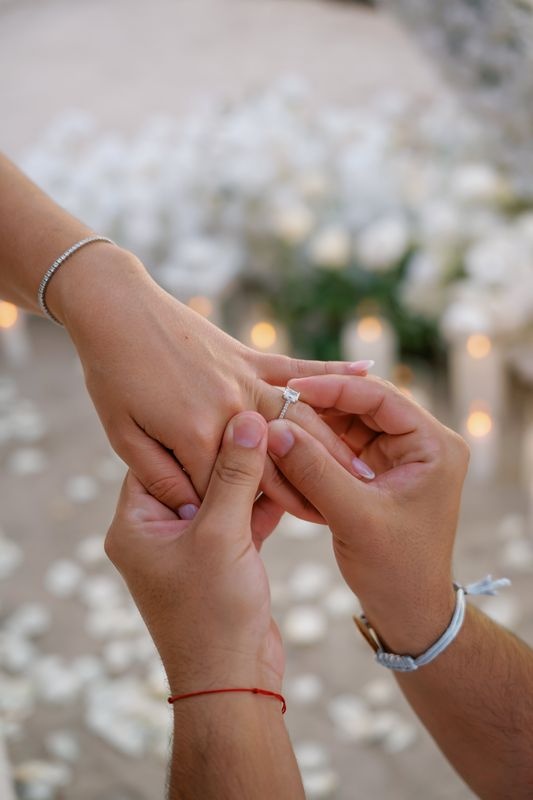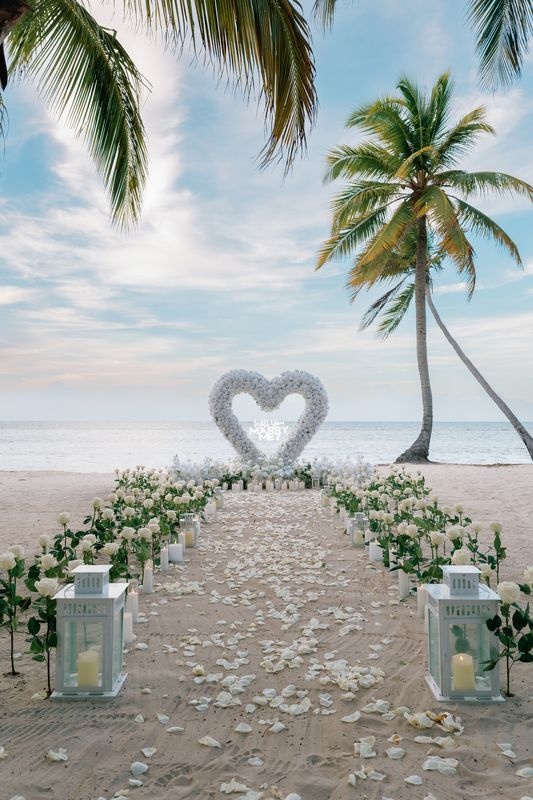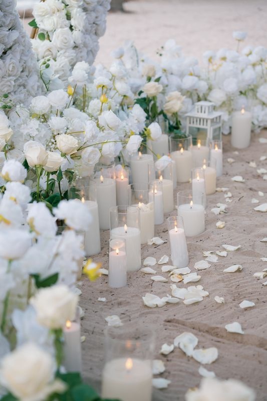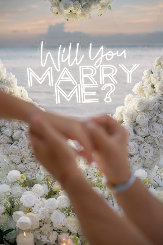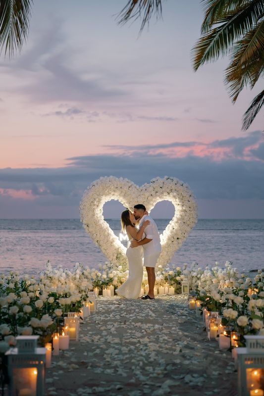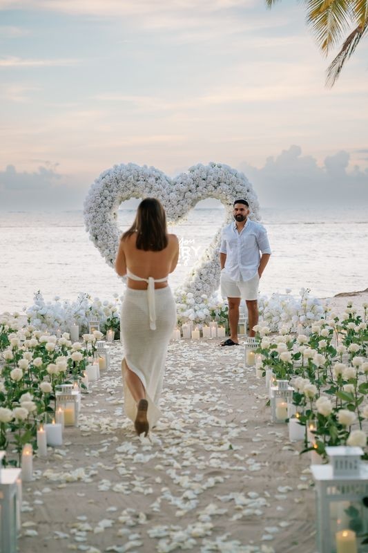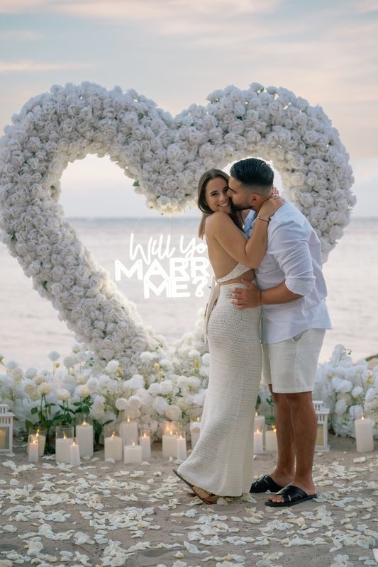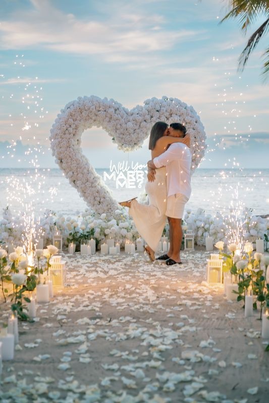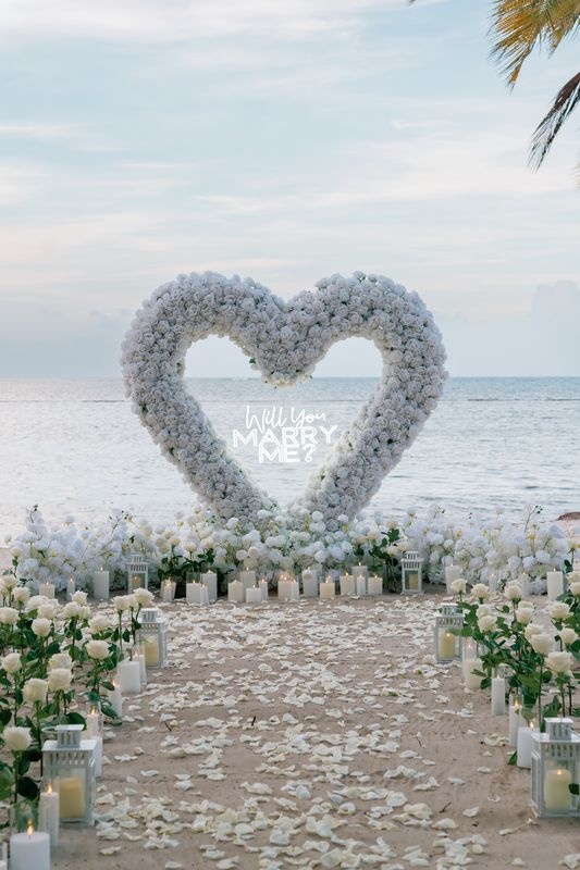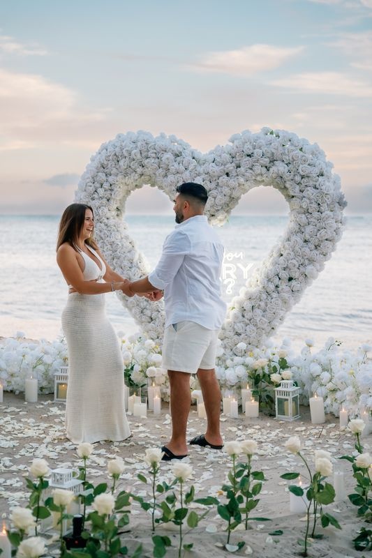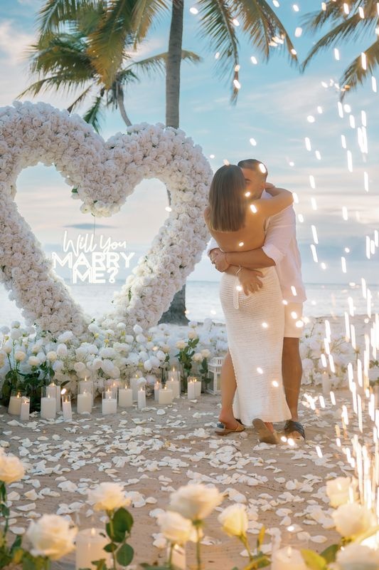 Esta propuesta comenzó con una joven pareja llegando a una playa escondida. La futura novia pensaba que solo sería un paseo romántico. Pero al pisar la suave arena, vio una escena impresionante. Un gran corazón de rosas blancas estaba en la arena con palabras luminosas en su interior: “¿QUIERES CASARTE CONMIGO?”. Un camino de pétalos de rosa conducía hacia el corazón, enmarcado por velas y elegantes rosas blancas a los lados.